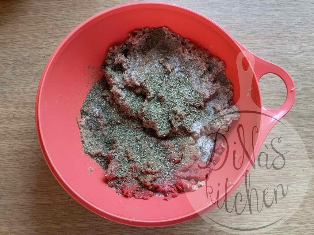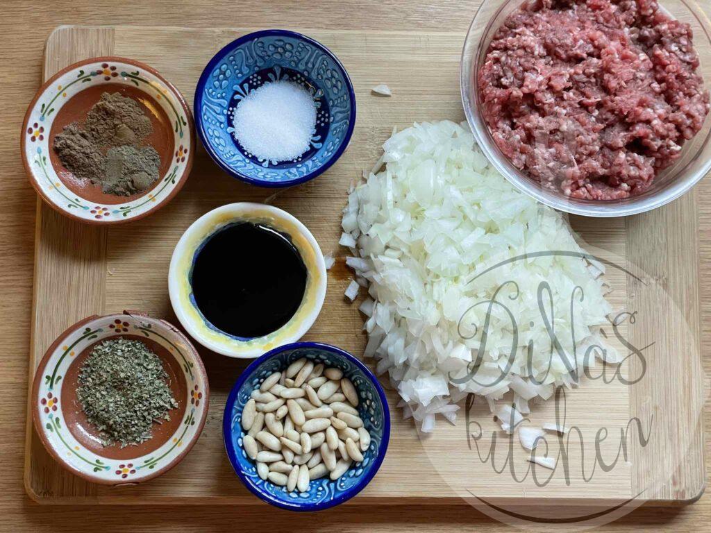 - Sauté the onions in the same frying pan for a few minutes until translucent. Add the meat and the spices and cook over medium-high heat for about 5 minutes or until the meat is done, stirring constantly. Crush the marjoram between the palms of your hands over the meat and mix in the pomegranate syrup. Adjust taste if required and fold in the pine nuts. Set aside for later use.