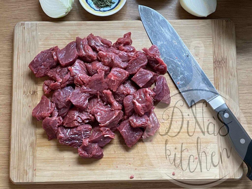 - For the kibbeh: Soak the bulgur in cold water for 10 minutes. In the meantime cut meat into small cubes (2 cm). Purée the meat in the food processor and transfer it to the bowl. Next purée the onions to a paste and add to the meat in the bowl. Set aside. Drain the water from the bulgur, transfer to the food processor and process for 2 minutes. Add to the meat and sprinkle with the salt, cinnamon, black pepper, allspice dried marjoram and mint. Mix well with your hands, adding 2 to 3 tablespoons cold water or as needed until it blends well to a smooth kibbeh.