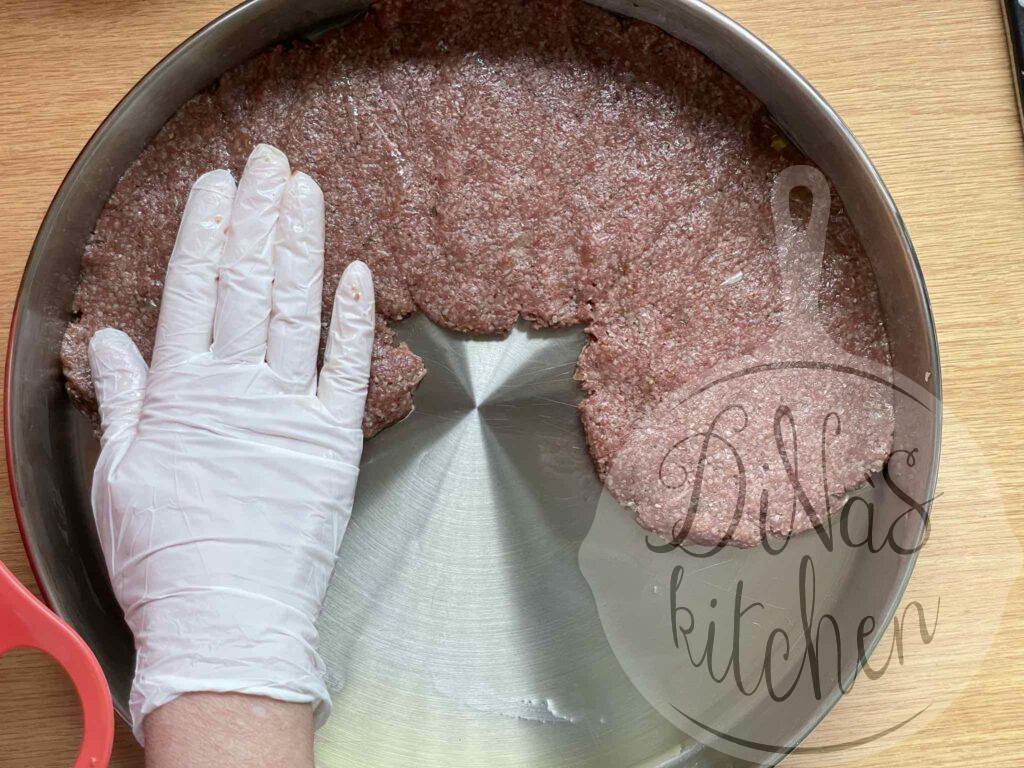 - Divide kibbeh mixture into 2 halves. Evenly spread one half in the greased pan by flattening small portions of the mixture with your oiled hands, to make a layer of about ½ cm thickness.
