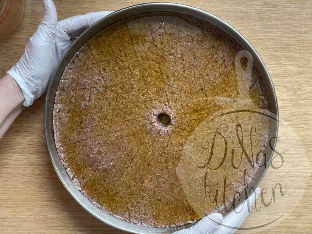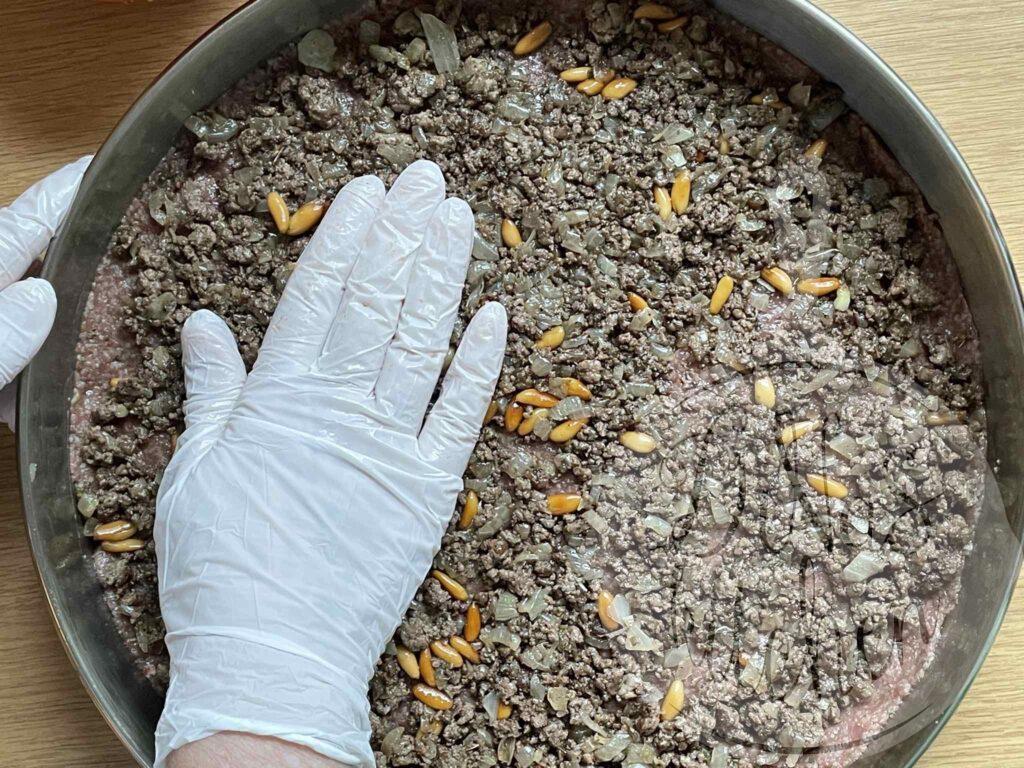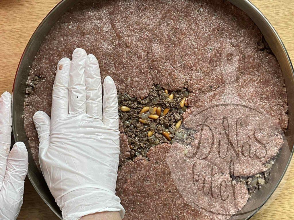 - Evenly spread the reserved stuffing over the first layer, pressing it slightly with your hand. Cover with the remaining kibbeh, by taking small portions at a time and flattening them with your slightly oiled hands. Press and smooth the surface with your hand. You might need to moist your hand with some cold water as well.