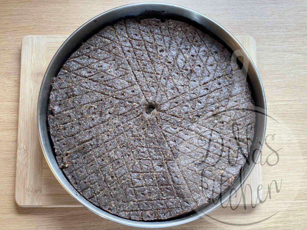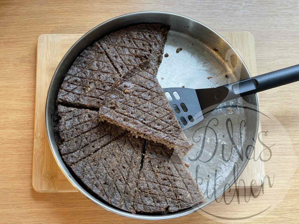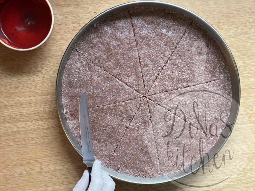 - With a thin-pointed knife cut the second layer in quarters or in 8 portions. Make a criss-cross pattern on the surface of each portion. Pierce the pattern with the tip of a sharp knife to allow oil to seep down. Pinch a hole with your index finger in the middle and pour in the olive oil.