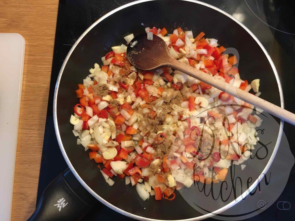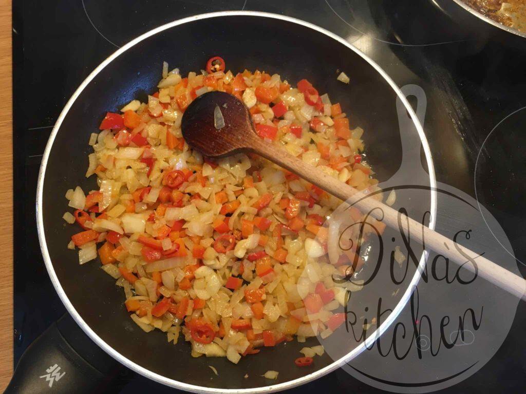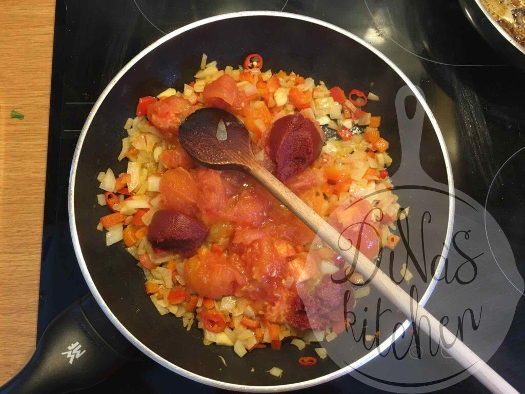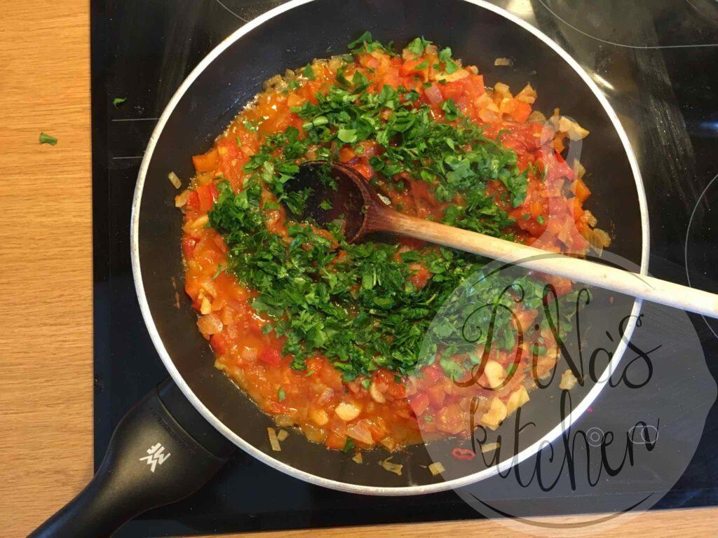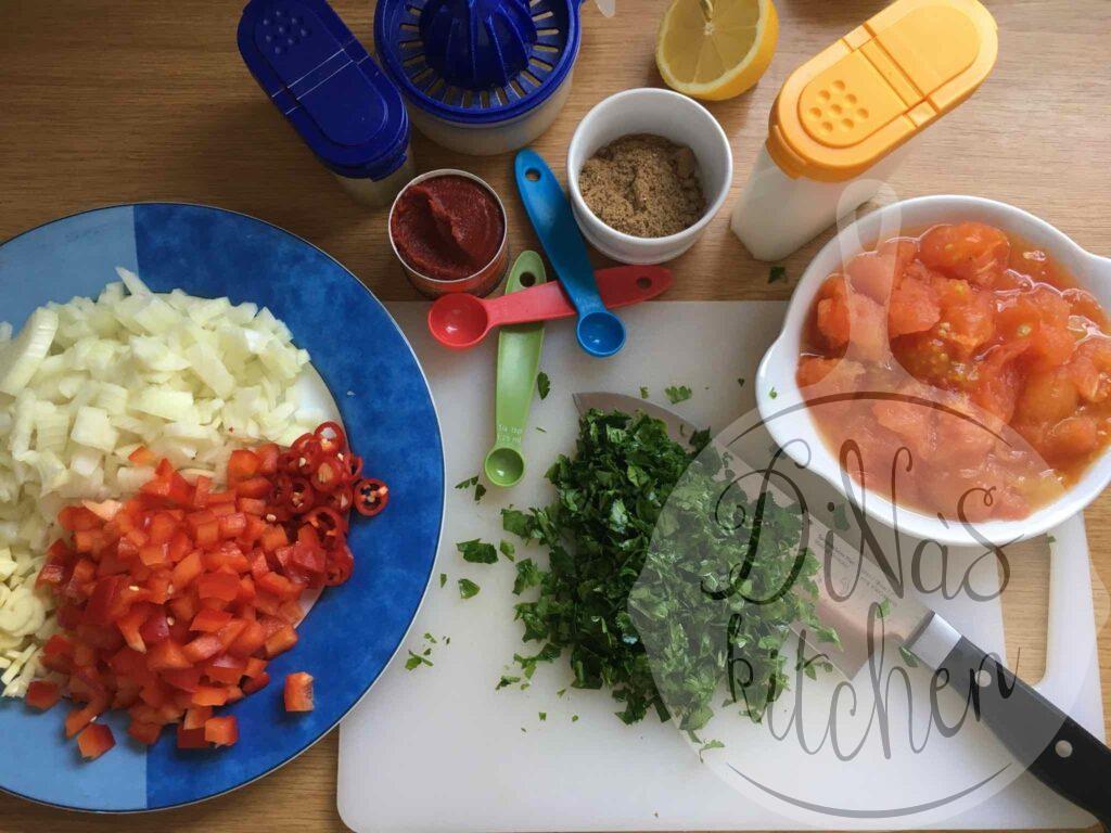- For the sauce: Heat the olive oil in a large frying pan over medium-high heat and sauté the onions, garlic, chilli, red pepper and coriander for 5 minutes. Reduce heat to medium-low and stir in the tomatoes, tomato paste and salt. Cover and cook for 10 minutes to break the tomatoes and thicken the sauce. Uncover and combine in the parsley and the lemon juice and cook for one minute.