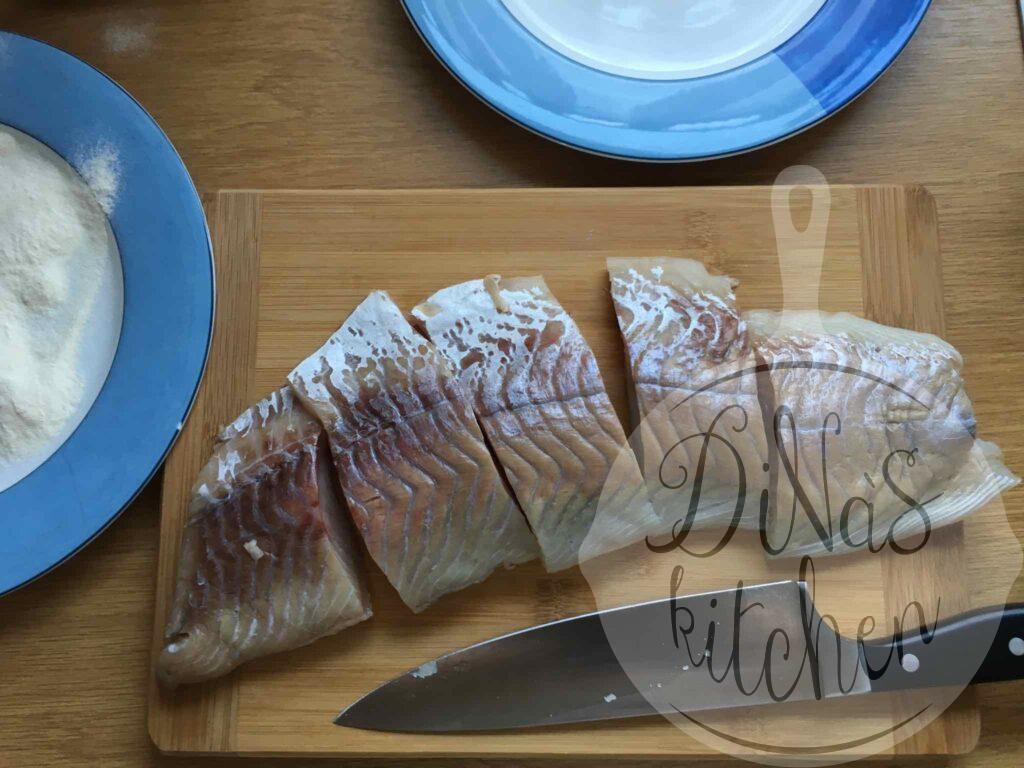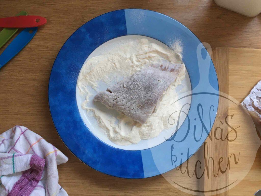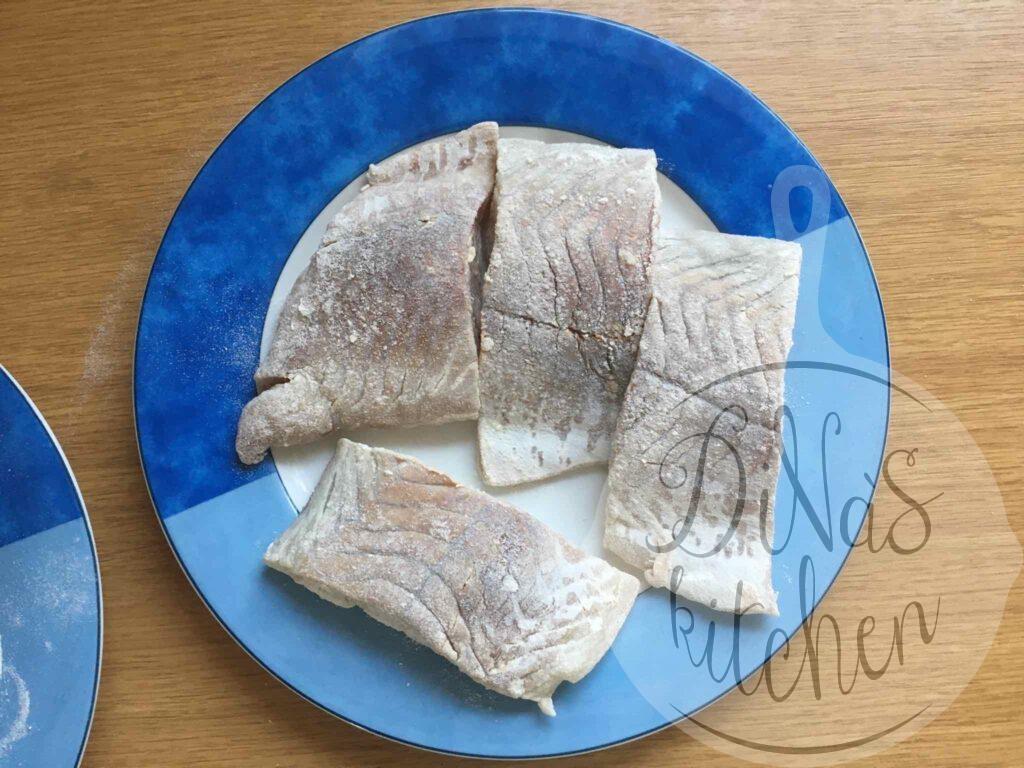 - For the fish: Wash the filets with cold water, pat dry and sprinkle with the salt. Add some flour to a plate and dredge the filets in flour to coat completely. Shake off any excess flour.