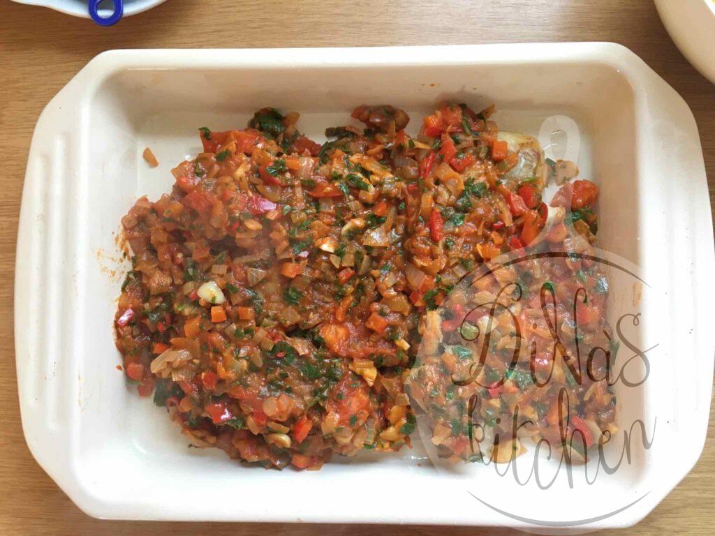 - Preheat oven (200°C, 400°F). Spread the sauce over the fish and cover with aluminium foil and bake on second lower rack for about 15 minutes. Serve hot with batata bi-l-furn.