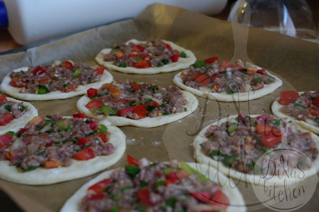 For a flavourful topping I generously season lamb minced meat with the warm spices of allspice, ground coriander, cumin and chili pepper. Then I mix in onions, garlic, green pepper, tomatoes, parsley, salt and lemon juice. I usually add the tomatoes just before spreading the topping on the dough. That way I ensure that tomatoes won’t have time to lose their juice. Too much tomato juice could wet the dough before baking.