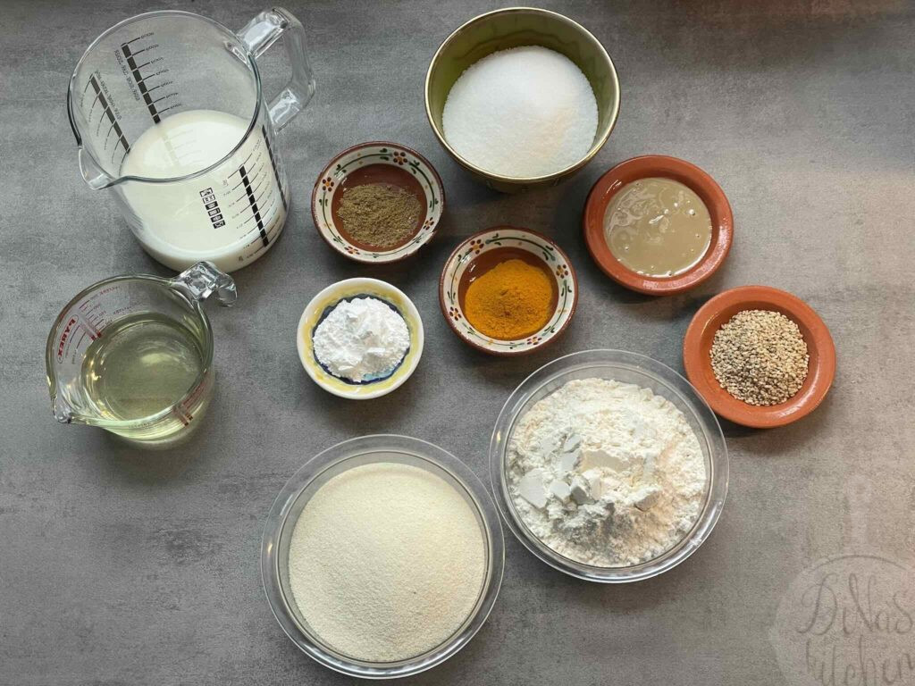1. Semolina: Semolina gives this cake its crumbly texture. Flour is also added in the recipe to reduce the crumbliness. The ratio of Semolina to flour varies from recipe to recipe. Mine is almost 1:1. The balance of flours used gives the cake the right texture: not too crumbly, not too spongey.