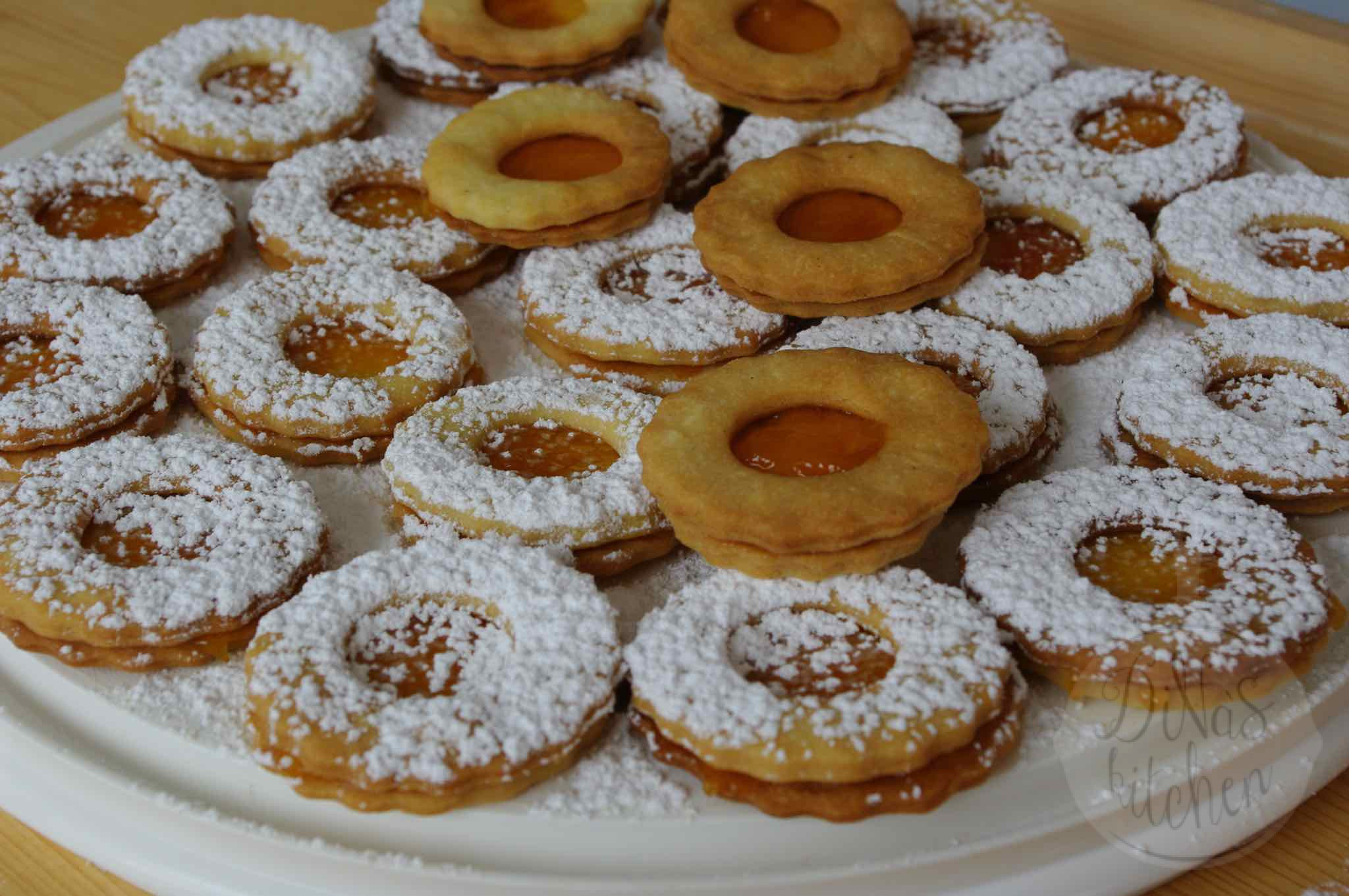 3. Let cool and fill with apricot jam. Sprinkle with confectioner’s sugar and keep in an airtight tin.