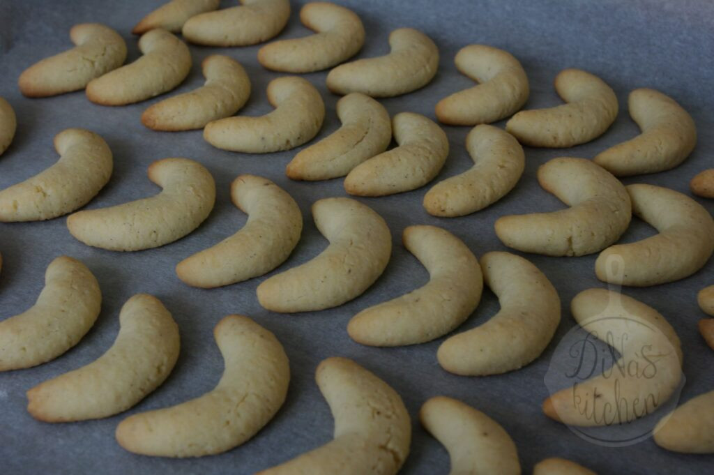 - Preheat oven (190°C). Bake on second lower rack for about 12 minutes or until edges are lightly browned. Roll the crescents with the sugar mixture while still hot. Remove to a rack to cool. Keep in a tin can.