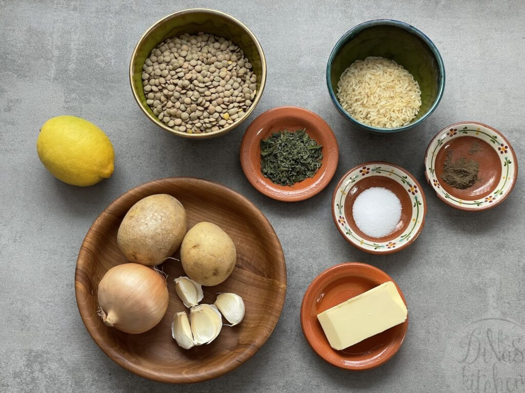 - To a medium pot add the lentils, rice, onions, potatoes and the water. Cover and bring to a boil over high heat. Reduce heat to medium-low and continue cooking for about 30 minutes, or until the lentils are soft.