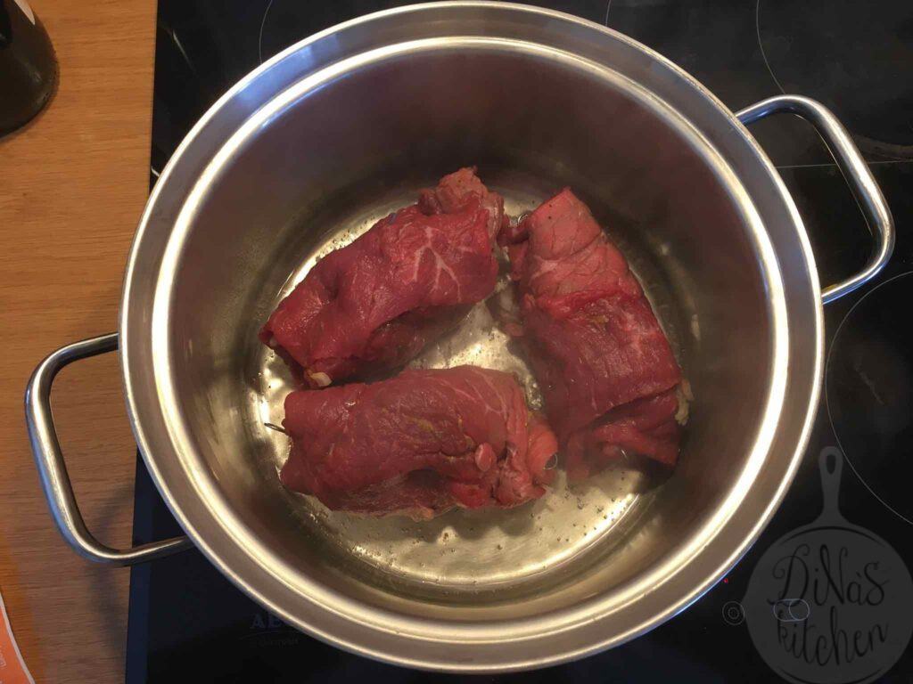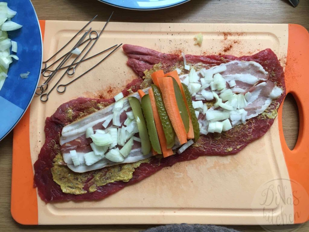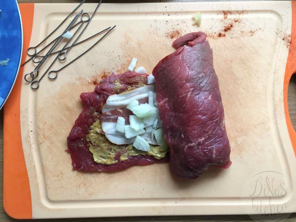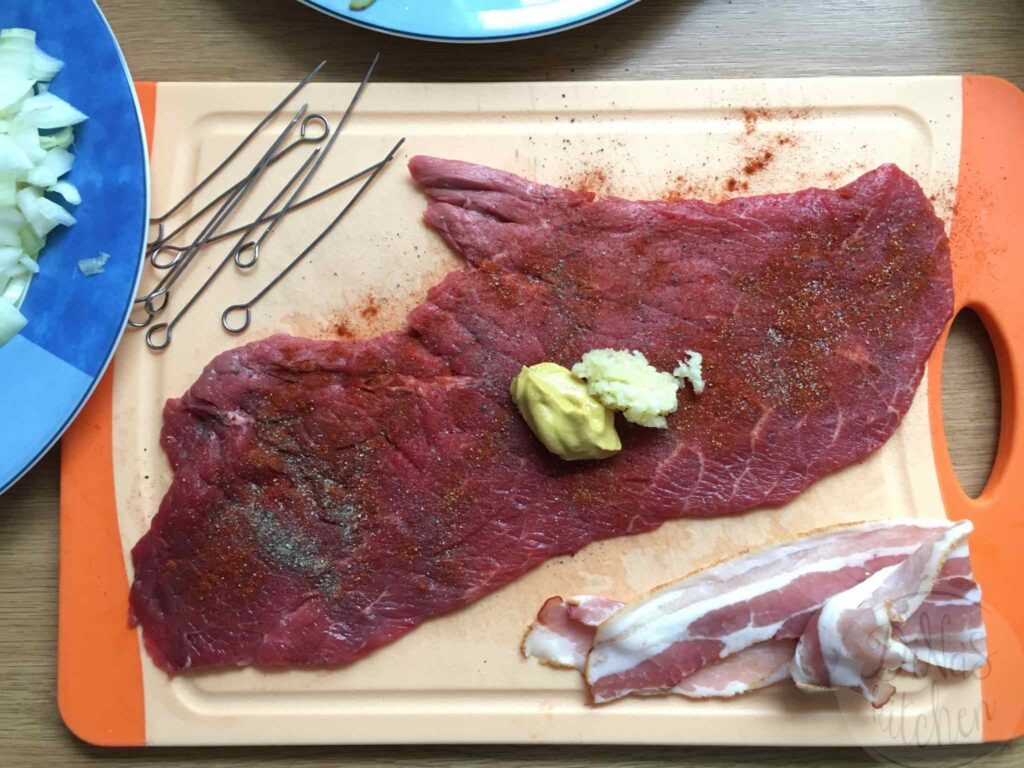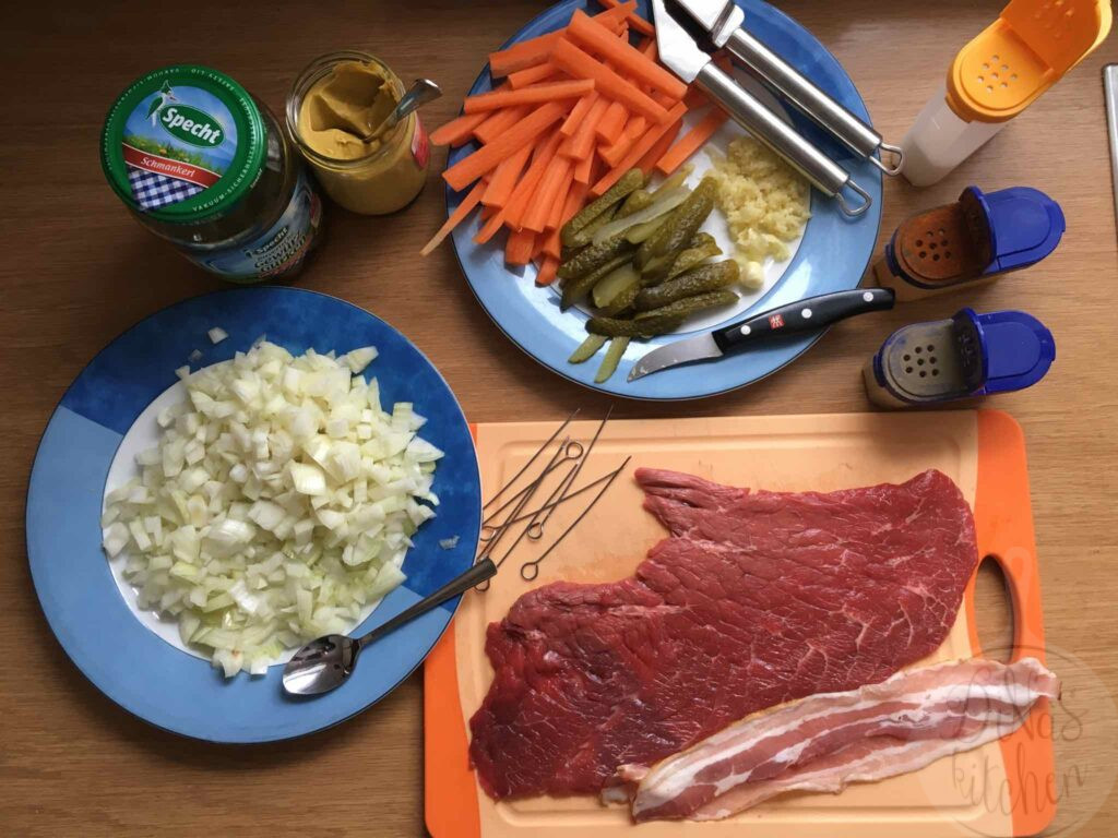 The recipe is very easy to make if you find the right cut of beef at your butcher’s. In Germany you can find “Rinderrouladen” all the time at the supermarket next door.