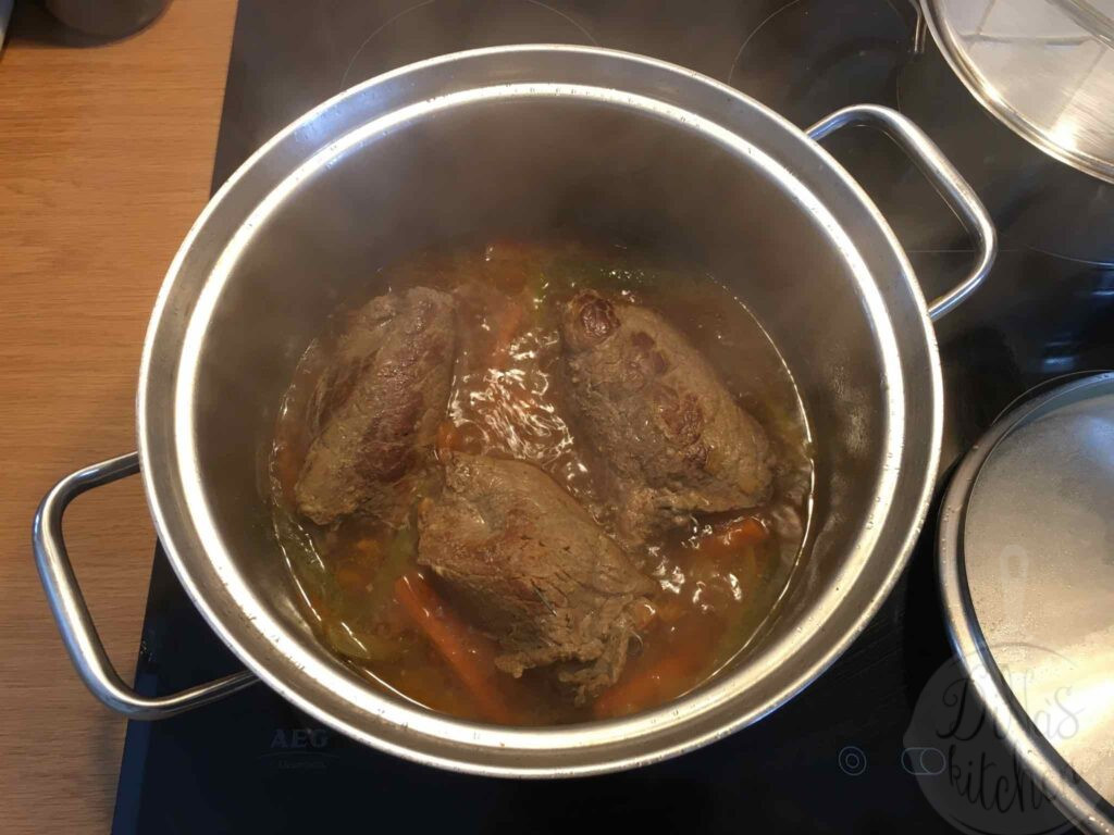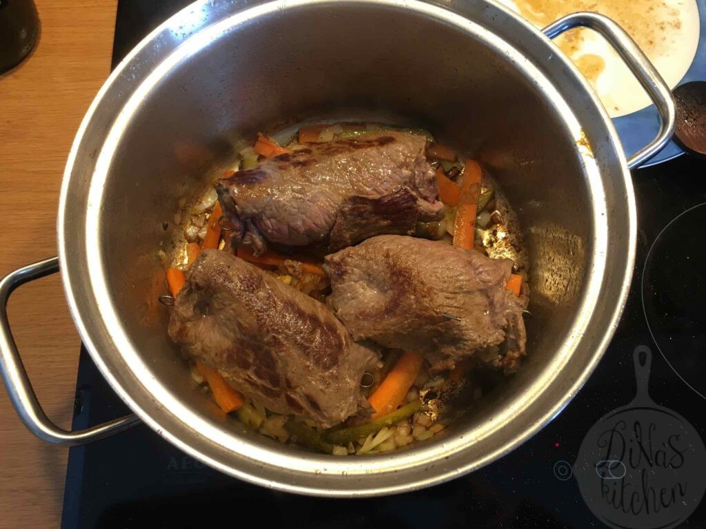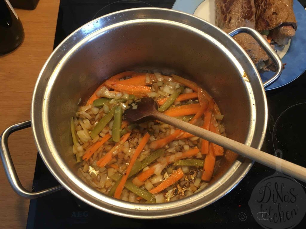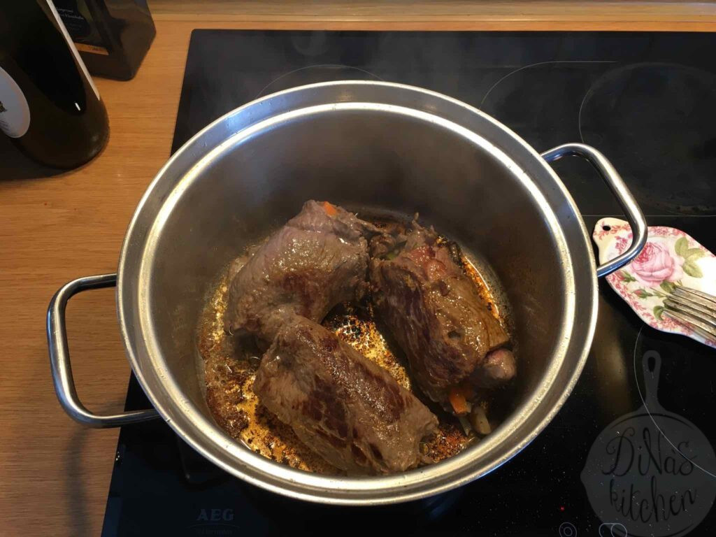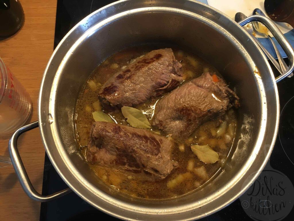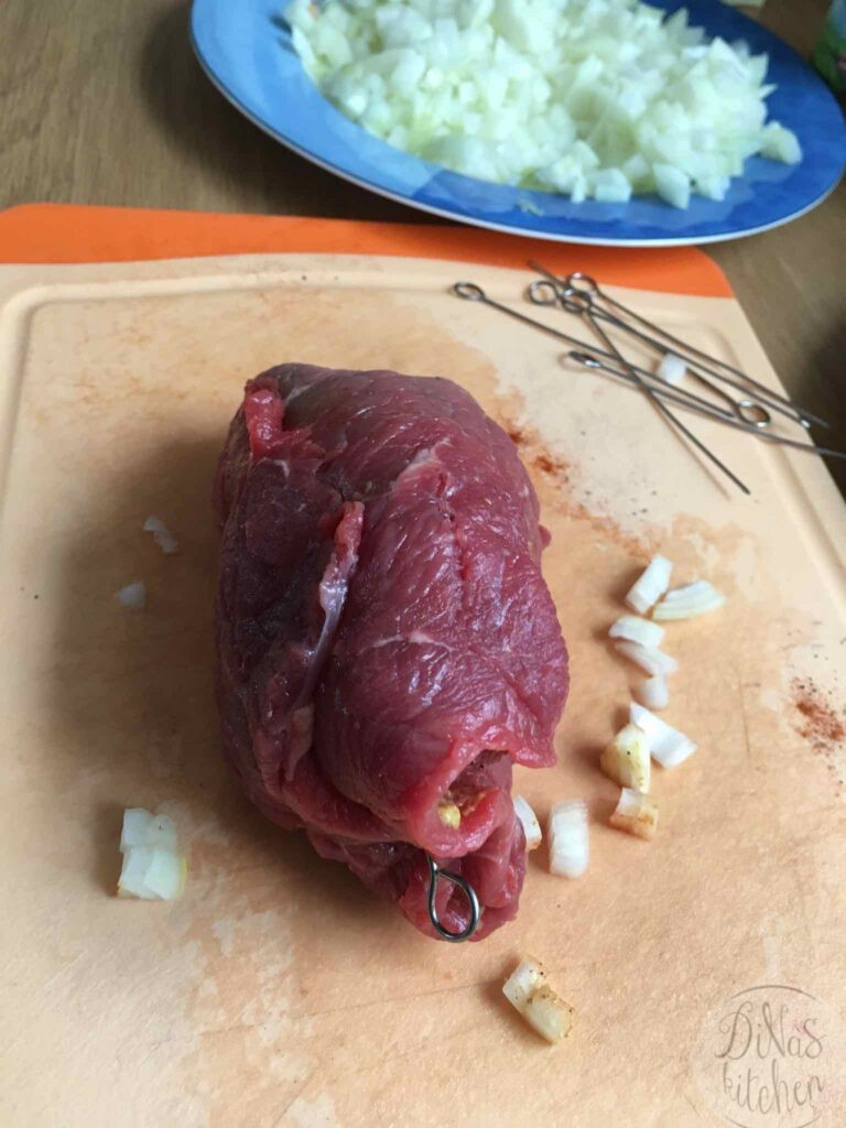 The recipe is very easy to make if you find the right cut of beef at your butcher’s. In Germany you can find “Rinderrouladen” all the time at the supermarket next door.