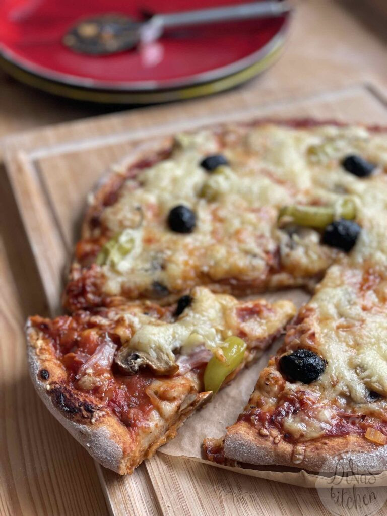 The choice of different toppings makes pizza one of the most versatile foods ever. I had pizza in delicious variations, and I am sharing with you, my favorite. The ingredients of the topping in the recipe below are enough for two large trays. Lately, I have been using 30-cm round pizza trays. This dough recipe is enough for two such trays.