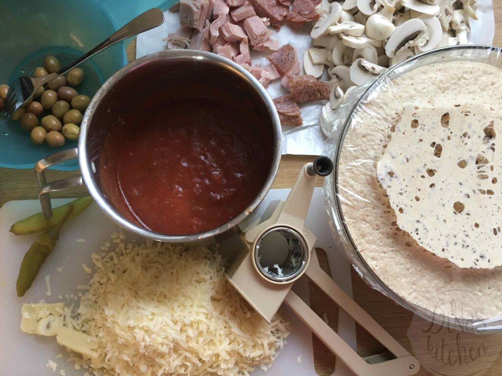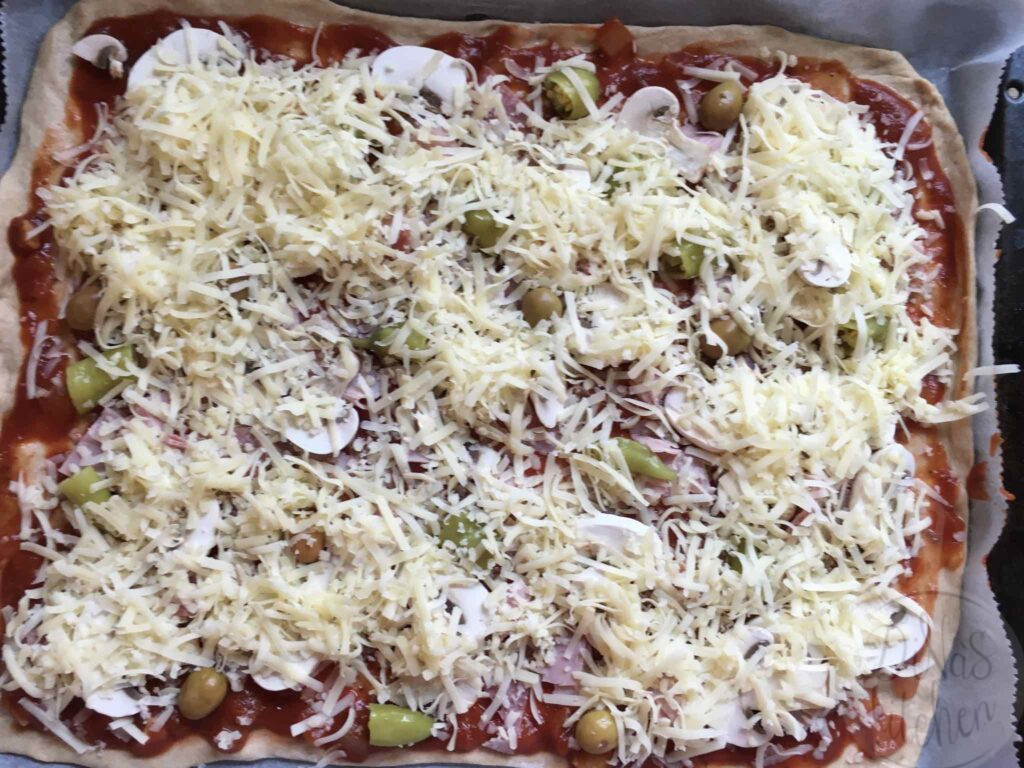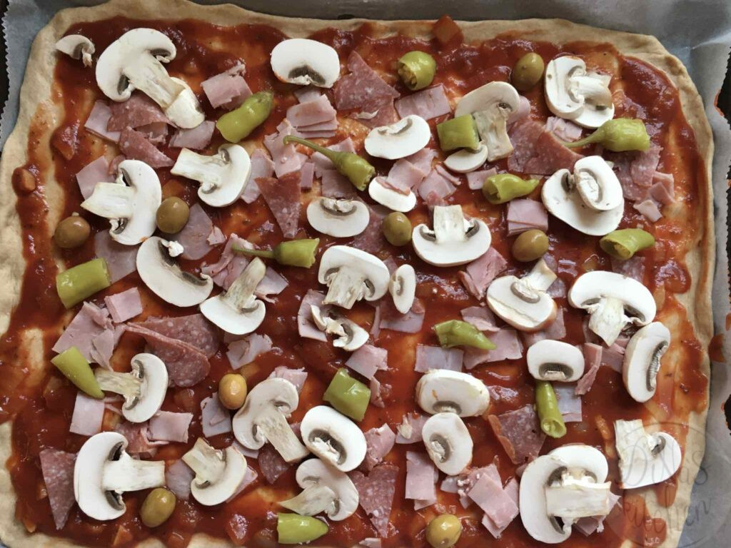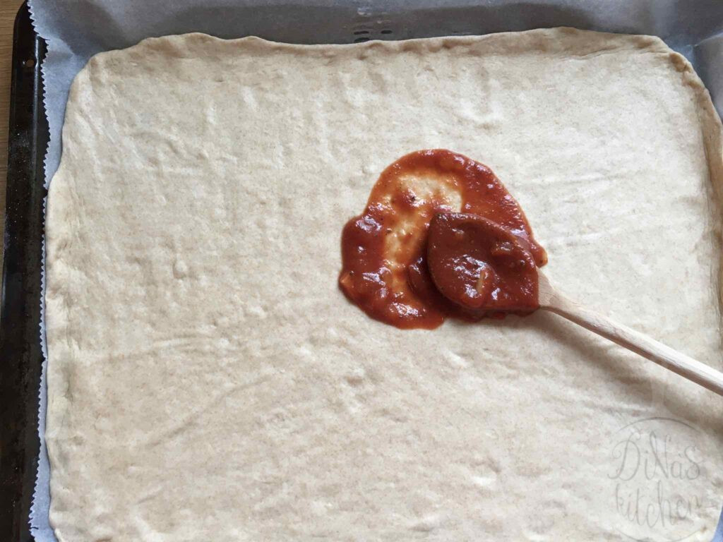 - Line 2 large baking sheets with parchment paper. Divide the dough in two equal parts. Roll out half of the dough on a lightly floured surface to 2 mm thickness. Carefully transfer onto the prepared sheet. Spread with half of the tomato sauce. Cover with half of the topping’s ingredients.