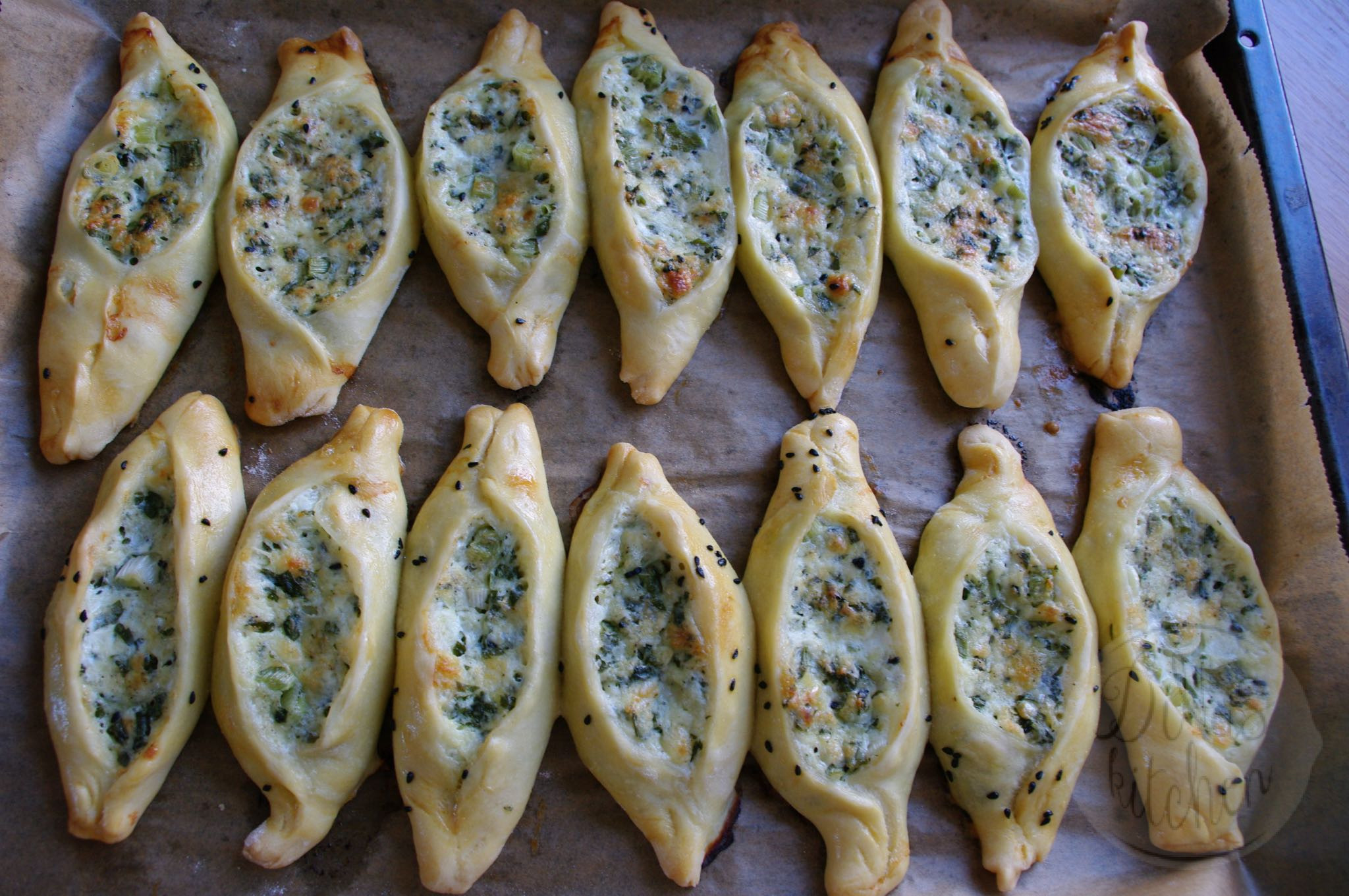 - Make the pies: On a slightly floured surface divide the dough into 32 pieces, forming each piece into a small ball. Cover with a clean towel and let rest for 15 minutes. Roll each ball into an oval shape (14x8 cm). Evenly spread a heaped tablespoonful cheese filling over the dough leaving 1 cm border. Fold in the long sides without completely covering the cheese and pinch the ends tightly to seal.